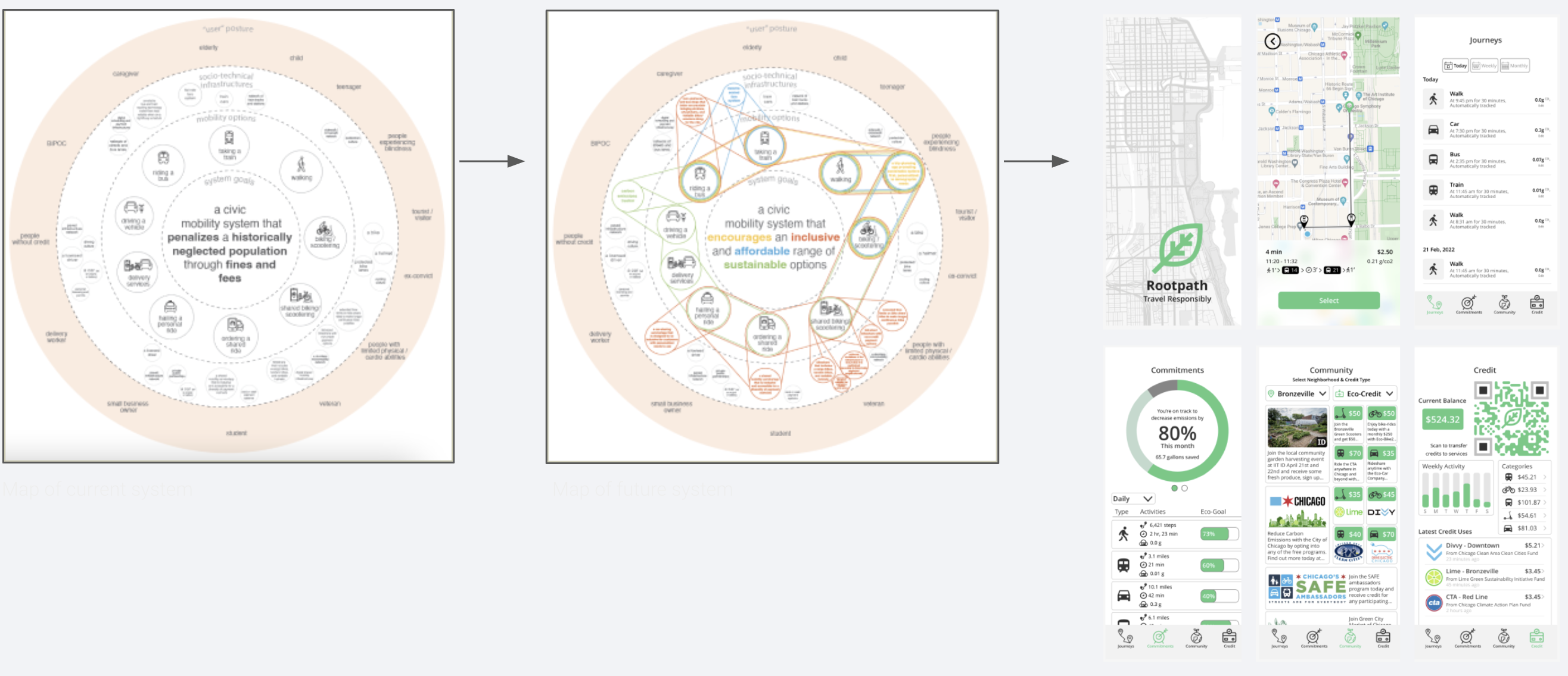 Those iterative prototyping sprints inspired us to envision how potential new products and services could have an equitable and sustainable impact on communities in Chicago. When I asked myself the question, “How might we reorient the goals of the fines & fees system to incentivize a shift away from cars and towards more active transit?” I identified an app that incentivizes sustainable transit decision-making with credits towards local civic investments as a highly impactful and equitable solution space and mocked it up as a concept of a product that could be included in our system re-design.